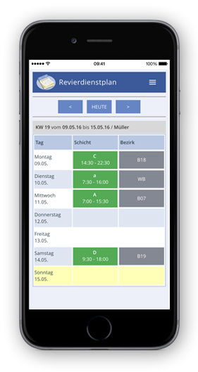 Revierdienstplan bietet neben dem Web-basierten Administrations- und Verwaltungszugang auch einen Mobile-Client, mit dem das eingeteilte Personal den eigenen Dienstplan über ein Smartphone abrufen kann.