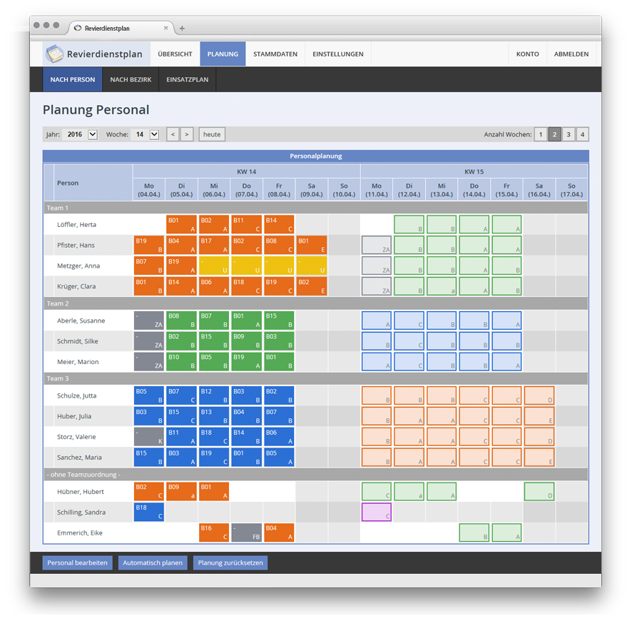 Revierdienstplan ist eine Cloud-basierte Softwarelösung zur Einsatzplanung von Personal in verschiedenen Bereichen. Revierdienstplan bietet umfangreiche Möglichkeiten zur Personal- und Schichteinteilung sowie einen automatischen Planungsassistenten durch den eine gleichmäßige Auslastung der Bereiche gewährleistet wird.